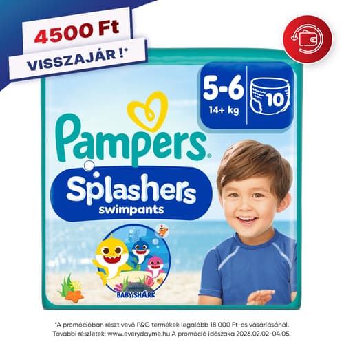 Kisbabád nyugodtan pancsolhat a vízben a Pampers Splashers eldobható úszópelenkában! Az átlagos pelenkákkal ellentétben a Pampers Splashers nem duzzad meg a vízben: fürdőbugyihoz hasonló kényelmet, és megbízható Pampers védelmet kínál. A bájos Baby Shark™ mintáknak köszönhetően hamarosan a kis rajongók kedvence lesz. Biztonságos védelmet nyújt a vízben, mivel a Pampers Splashers úszópelenka dupla védőgátjai kényelmesen illeszkednek kisbabád combjaihoz, így elősegíti, hogy a pelenka tartalma benn maradjon. Megfelelő viselet az uszodában, a strandon vagy akár az aquaparkban. Az egyedülálló 360°-os, rugalmas derékgumírozásnak köszönhetően kényelmesen illeszkedik, ugyanakkor könnyen feladható és levehető, még nedvesen is. A Pampers Splashers könnyen feltéphető oldalakkal rendelkezik, így gyorsan eltávolítható és kidobható.