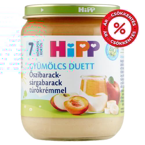 A Hipp duettek pépesített biogyümölcsöket és krémes állagú joghurtot vagy túrót tartalmaznak, 7 hónapos kortól fogyaszthatóak tízóraira vagy uzsonnára. Ízletes desszertek a nagyobb gyermekeknek is.