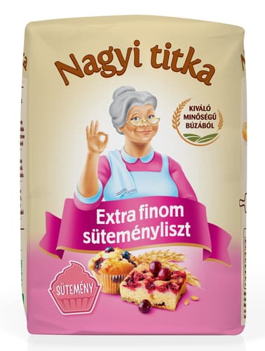 Grandma's secret Extra fine pastry flour. Hungary's favourite flour brand! Continuously controlled, reliable quality, carefully selected, thoroughly cleaned wheat. Can be mixed with liquid ingredients without lumps. High-rising, soft sponge cake.