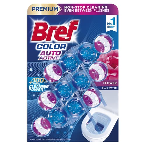 A Bref Blue Active Fresh Flowers WC-frissítő a Bref Color Aktiv technológiájának köszönhetően láthatóan hosszan tartó tisztaságot és frissességet biztosít a WC-ben, még az öblítések között is. Kellemes friss virág illattal tölti meg a fürdőszobát. Ez az EU-ból származó 3 darabos kiszerelés egyszerűen felakasztható a WC-csésze peremére, ahol a vízáramlás a legjobb, így folyamatosan gondoskodik a higiéniáról és a kellemes illatról.