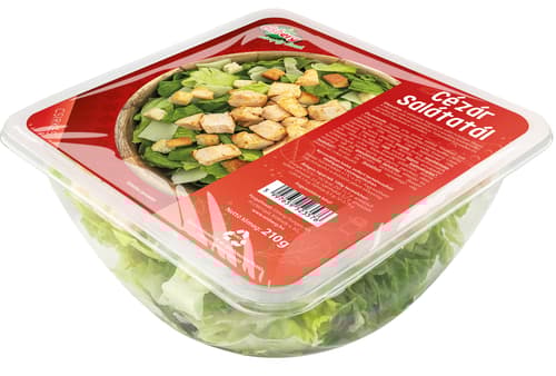 Contents: romaine lettuce, cherry tomatoes, parmesan cheese, croutons, Caesar dressing.