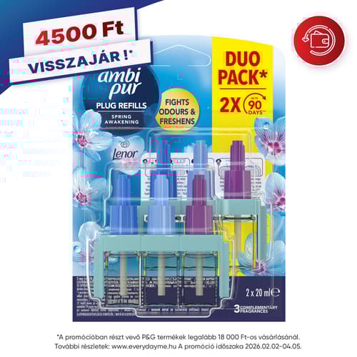 Az Ambi Pur 3Volution Spring Awakening folyamatosan szünteti meg a kellemetlen szagokat és váltogatja a 3 egymást kiegészítő illatot, így a frissesség mindig érezhető. Akár 90 napon át tart (alacsony fokozaton, napi 12 órás használat esetén). Fedezd fel a kettős hatású Spring Awakening szépségét (az alaptermékekhez képest): Messzebbről érezhető, intenzív illat, amely betölti a helyiséget. A Spring Awakening légies, zöld illatát a Lenor természetes, tavaszi frissessége ihlette. Engedd, hogy körbeölelje érzékeidet a megnyugvás tiszta és gyengéd illata! Az általános illatpárologtató készülékek esetében orrunk gyorsan hozzászokik az illatokhoz, melyeket egy idő után már nem érzünk. Az Ambi Pur 3Volution folyamatosan megújuló frissességet kínál, miközben 45 percenként automatikusan váltogatja a 3 egymást kiegészítő, kiváló minőségű illatot. Az Ambi Pur 3Volution utántöltő kizárólag az Ambi Pur 3Volution elektromos diffúzorral használható, amely frissességgel és kellemes illattal tölti meg otthonodat a hét minden napján. A 3Volution lehetővé teszi az illatintenzitás szabályozását, így bármikor segít megteremteni a hangulatodhoz illő környezetet.