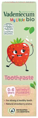 A természetes eper aromával ízesített Vademecum Bio fogkrém gyengéden tisztítja a tejfogakat. 1-6 éves gyermekek számára ajánlott. Ecocert Cosmos Organic tanúsítvánnyal ellátva:- 99%-ban természetes összetevők*- 23%-ban biogazdálkodásból- Nem tartalmaz fluoridot