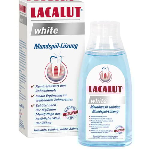 Fogmosás után a LACALUT white szájvíz gátolja a fogkő képződését, és megőrzi a megtisztított fogak természetes fehérségét.