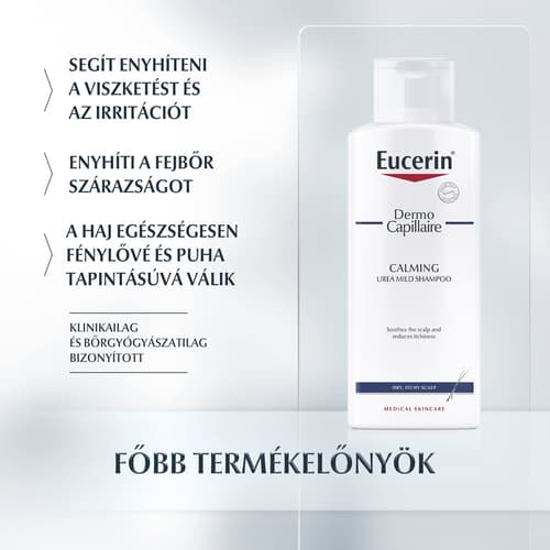 Eucerin DermoCapillaire 5% urea sampon, 250 ml-es kiszerelésben. Ez a gyengéd sampon kifejezetten száraz, viszkető fejbőrre lett kifejlesztve. Hatékonyan tisztít, intenzíven hidratálja a fejbőrt és azonnal enyhíti a viszketést. Kényeztesse fejbőrét ezzel a speciális ápoló samponnal, hogy újra komfortosan érezze magát!