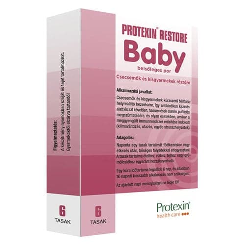 A Protexin-Restore szájon át szedhető por praktikus tasakokban kapható, kifejezetten csecsemők és kisgyermekek számára készült. Ez a probiotikus por az egészséges bélflóra támogatására és helyreállítására szolgál, 7 jótékony élő baktériumtörzset tartalmaz. Minden csomag 6 tasakot tartalmaz, kíméletes és hatékony megoldást nyújtva a kicsik emésztésének támogatására.