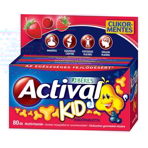 Actival Kid rágótabletta komplex étrend-kiegészítő multivitamin ásványi anyagokkal, nyomelemekkel és édesítőszerekkel, 3 finom gyümölcs ízben elsősorban gyermekek részére. A megfelelő vitamin, ásványi anyag és nyomelem bevitel hozzájárul a jó közérzethez, fizikai és szellemi teljesítményhez és ellenálló képességhez. Az Actival Kid fogyasztása hozzájárul a megfelelő vitamin, ásványi anyag és nyomelem bevitelhez.
