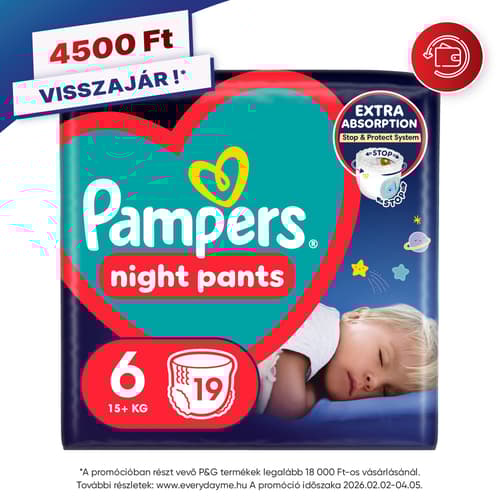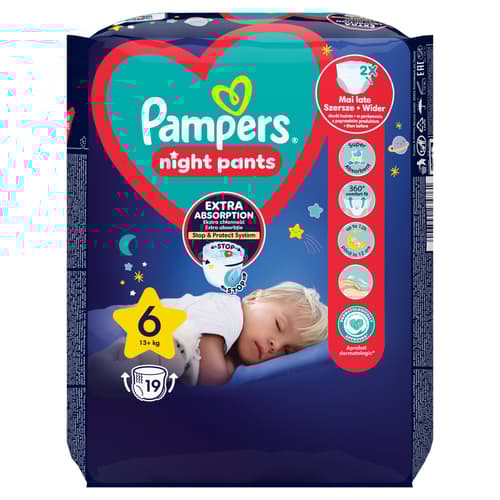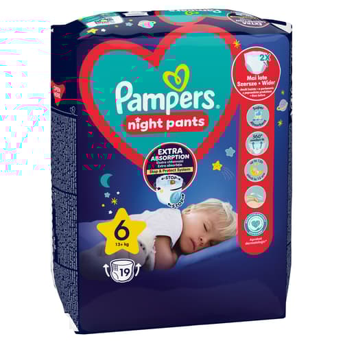 A Pampers legkiválóbb éjszakai védelme a Pampers Night Pants éjszakai bugyipelenkával: szupererős nedvszívó magjának köszönhetően a Pampers legjobb nedvszívó képességű terméke, az akár 100%-ban szivárgásmentes éjszakákért. A 360°-os derékrész rugalmasan igazodik a kisbaba éjszakai mozdulataihoz, a Stop & Protect kakitasi pedig segít megelőzni a hátoldali szivárgást. Az összes többi Pampers pelushoz hasonlóan a Pampers Night Pants bugyipelenkát is könnyű cserélni, még akkor is, ha közben kisbabád izeg-mozog.