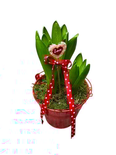 Jácint hajtás bádog vödörben, Valentin napi táblával, szalaggal