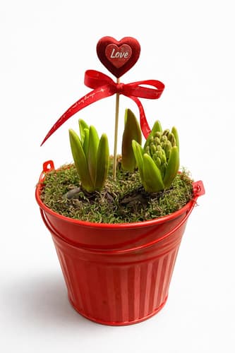 Jácint hajtás bádog vödörben, Valentin napi táblával, szalaggal