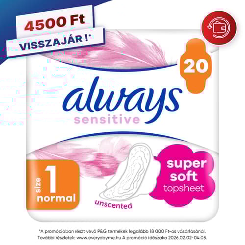 A pamutszerű, puha fedőréteg és az egyedi komfortzónák extra kényelmet jelentenek az érzékeny bőrnek. A menstruációs ciklus átlagos napjaira ajánlott. A szárnyak további védelmet nyújtanak a széleken, és segítenek helyén tartani az egészségügyi betétet. Az 1-es méretű Always Ultra Sensitive Normal szárnyas betét az Always Sensitive családba tartozó legjobb egészségügyi betét a gyengébb és az átlagos menstruációs napokra.