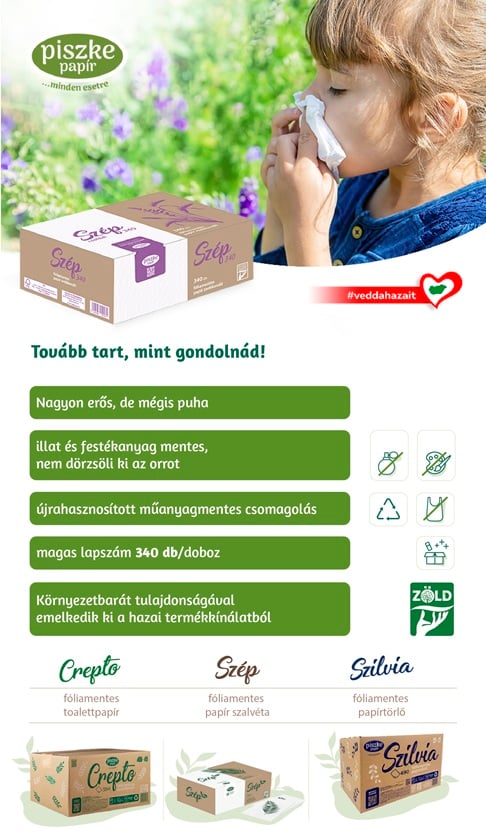 Choose the foil-free, environmentally friendly Szép paper handkerchief. Excellent quality, extremely soft to the touch, 3-ply paper handkerchief made of 100% cellulose, in a 340-piece package: