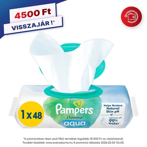 Gyengéden ápolja és védi a kisbaba finom bőrét – kíméletes bőrápoló balzsam 99% víztartalommal. A Pampers Harmonie Aqua törlőkendő gyengédebb, mint a pamut és a víz használata. Egyedülálló formulájának köszönhetően a gyengéd tisztító hatóanyagok és a bőrvédő összetevők segítenek a bőr természetes pH-értékének helyreállításában, és védelmet nyújtanak az irritációval szemben. 0% alkohol és illatanyag felhasználásával készül. Bőrgyógyászatilag tesztelt formula. A terméket a Skin Health Alliance bőrgyógyászai is jóváhagyták, minősítése pedig a Standard 100 by OEKO-TEX előírásai szerint történt.