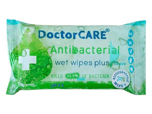 Doctor CARE® antibakteriális nedves törlőkendő Aloe Vera kivonattal 100% biodegradable 15db fertőtlenítőszerrel átitatott törlőkendő. Terméktípus: PT 1, PT2. Antibakteriális nedves törlőkendő higiénés kézfertőtlenítésre és felületfertőtlenítésre. Felhasználói kör: lakossági és professzionális. Antimikrobiális spektrum: baktericid, fungicid. Hatékony védelmet biztosít. Glicerinnel és Aloe Vera kivonattal ápolja, puhítja a bőrt és védi a kezeket a kiszáradástól. Gyors, egyszerű tisztálkodás szappan és víz nélkül. Nem tartalmaz alkoholt. Minimális behatási idő: 5 perc. Biocid hatóanyag: 0,3% benzalkónium-klorid (CAS-szám: 68424 -85-1, EK-szám: 270-325-2). Egyéb összetevők: tartósítószerek (Phenoxyethanol, Benzoic Acid, Dehydroacetic Acid, Sodium Benzoate, Potassium Sorbate), illatanyagok. A kendő anyaga 100%-ban lebomló.