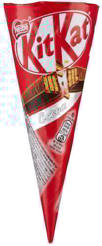 Kakaós jégkrém csokoládé ízű öntettel (3,5%) és Kit Kat szelettel 13% (ostya tejcsokoládéban), ostyatölcsérben (13%).
