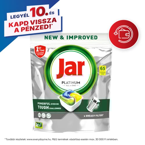 A Jar Platinum all-in-one mosogatókapszula már az első mosogatás alkalmával elbánik még a makacs szennyeződésekkel is, és ragyogóan tiszta edényeket hagy maga után. A Jar Platinum tisztítóerejében bízva bármilyen ételt kedvére elkészíthetsz, hiszen a termék még a zsíros szűrőt is megtisztítja, ragyogóan tiszta edényeket és friss illatú mosogatógépet hagy maga után. A Jar egyetlen kapszulában ötvözi a folyékony és a por állagú mosogatószerek erejét. A rendkívül gyorsan oldódó párnácska szinte azonnal kifejti tisztító hatását, így gyorsan és hatékonyan elvégzi a munkát. Ráadásul rendkívül egyszerűen használható: nem kell kicsomagolni, egyszerűen csak helyezd a kapszulát a mosogatógép mosogatószer-adagolójába!