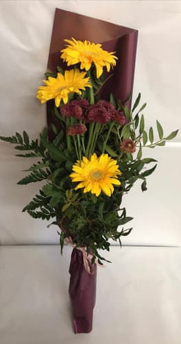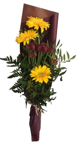 Őszi csokor (Gerbera 3 szál, Santini krizantém 1 szál, Pisztácia 1 szál, Rumora 2 szál)