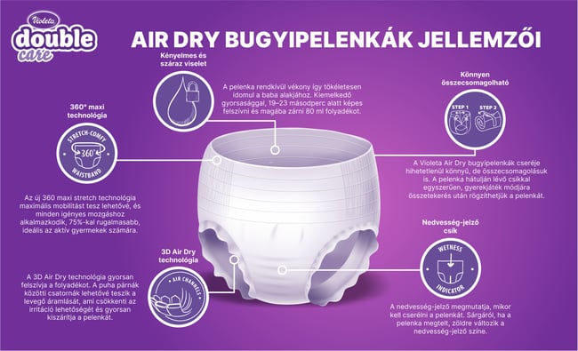 A Violeta Double Care Pants bugyipelenka hihetetlenül puha, és szuper nedvszívó képességet garantáló prémium Air Dry technológiával készül. A pelenka belső – a baba bőrével közvetlenül érintkező – részén csatornák találhatóak, melyek lehetővé teszik a pelusba kerülő folyadék jobb eloszlást és gyorsabb felszívódást. Ezek a pihe-puha gödröcskék biztosítják a megfelelő levegőzést a pelenkában, így akadályozva meg a bőr kipirosdását és a pelenkakiütés kialakulását.