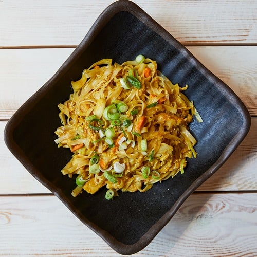 A curry az ázsiai konyha elengedhetetlen kelléke, így hát ki nem hagyhattuk a kínálatból – pirított tésztás főételünkben csirkével és risztésztával találkozik a jellegzetes színű curry szósz, a végeredmény pedig mind színben, mind ízben felejthetetlen!