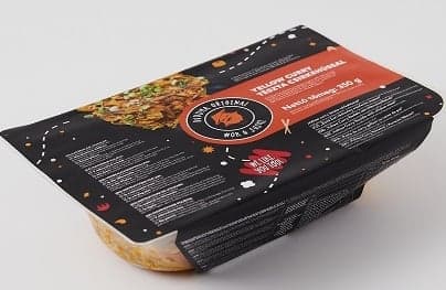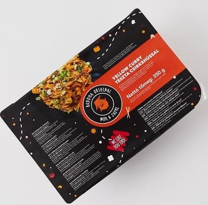 Védőgázas csomagolású készétel, rízstészta sárga curry szósszal és csirkehús készítménnyel