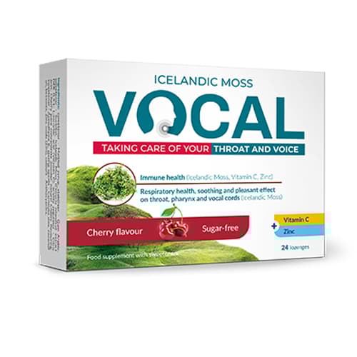 A VOCAL szopogatótabletta cseresznye ízben izlandi zuzmót, C-vitamin és cink elegyet tartalmaz. Az izlandi zuzmó (Cetraria islandica) enyhíti a torok és a garat irritációját.