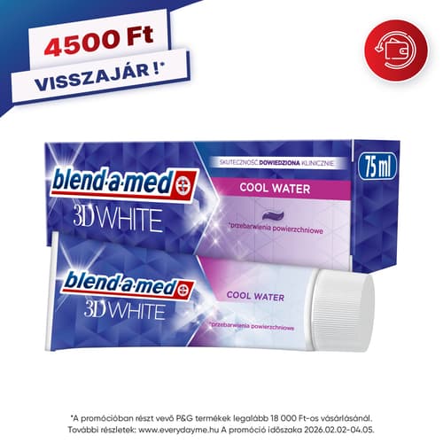 A Blend-a-med 3D White Cool Water klinikailag igazolt, 3 az 1-ben hatású fogkrém: eltávolítja a felületi elszíneződéseket, már az első fogmosással megkezdi a fogfehérítést, valamint erősíti és óvja a fogakat.