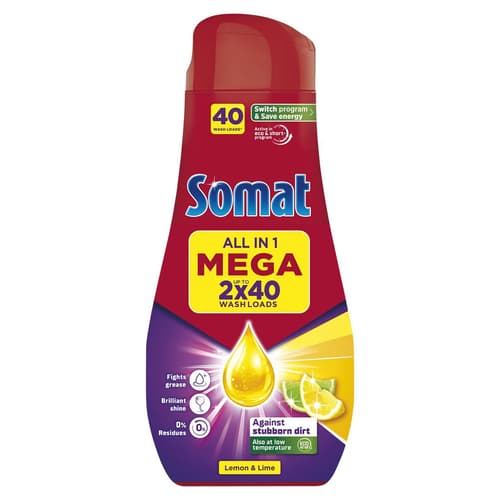 Somat All in 1 Gél - Ez a multifunkcionális gél hatékonyan tisztít és csillogó edényeket biztosít alacsony hőmérsékletű eco és alacsony hőmérsékletű rövid mosogatási programokban is! Sokoldalú aktív formulája azonnal feloldódik és kifejti erőteljes tisztító hatását minden típusú szennyeződésen. Mosogatószer maradvány nélkül eco és rövid programokban is - nem hagy maga után mást, csak tiszta és fényes edényeket kellemes citrus illattal.