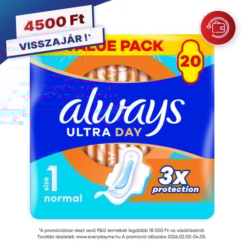 „Ne érd be kevesebbel, válaszd a 3x-os védelmet nyújtó, 1-es méretű ALWAYS Ultra Day Normal szárnyas egészségügyi betétet! A nedvszívó és gyengéd fedőréteggel rendelkező Always betét InstantDry technológiájának köszönhetően másodpercek alatt felszívja a nedvességet, a LeakGuard és OdorLock technológia pedig segít megelőzni a szivárgást és a kellemetlen szagokat. Az egyedülálló ComfortLock szárnyakat úgy tervezték, hogy bármilyen típusú fehérneműhöz remekül illeszkedjenek. A fokozott éjszakai védelem érdekében próbáld ki a különböző méretekben kapható Always Night betétet! Az Always Ultra egészségügyi betétek a Skin Health Alliance bőrgyógyászati jóváhagyásával rendelkeznek.