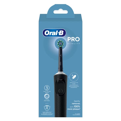 The Oral-B Vitality Pro electric toothbrush is clinically proven to provide a superior clean vs. a regular manual toothbrush. The toothbrush has three cleaning modes: daily clean, sensitive, and sensitive plus for an extra gentle brushing experience. The in-handle timer helps you brush for the dentist-recommended 2 minutes. All from Oral-B, the #1 toothbrush brand used by dentists worldwide.