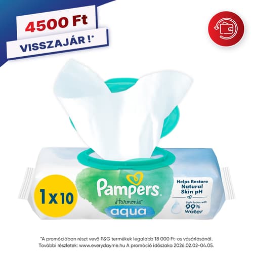 Gyengéden ápolja és védi a kisbaba finom bőrét – kíméletes bőrápoló balzsam 99% víztartalommal. A Pampers Harmonie Aqua törlőkendő gyengédebb, mint a pamut és a víz használata. Egyedülálló formulájának köszönhetően a gyengéd tisztító hatóanyagok és a bőrvédő összetevők segítenek a bőr természetes pH-értékének helyreállításában, és védelmet nyújtanak az irritációval szemben. 0% alkohol és illatanyag felhasználásával készül. Bőrgyógyászatilag tesztelt formula. A terméket a Skin Health Alliance bőrgyógyászai is jóváhagyták, minősítése pedig a Standard 100 by OEKO-TEX előírásai szerint történt.