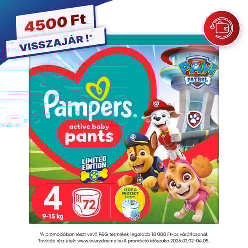 Pampers Active Baby Pants Bugyipelenka Mancs Őrjárat, Méret: 4 (9-15 kg) 72 db