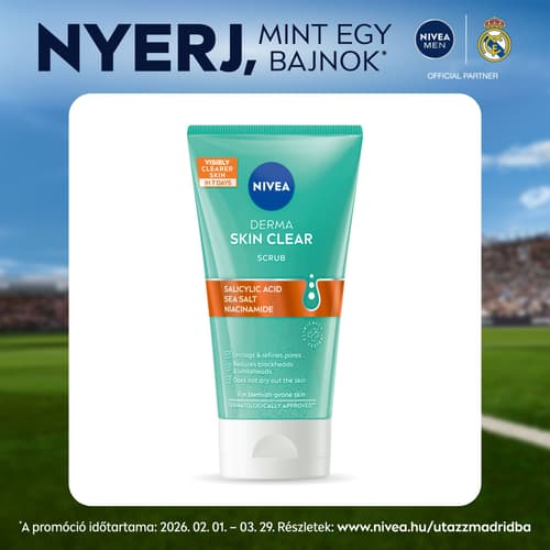 NIVEA Derma Skin Clear tisztító hatású bőrradír szalicilsavval és niacinamiddal arcra és testre. Vegán formula - nem tartalmaz állati eredetű összetevőket.
