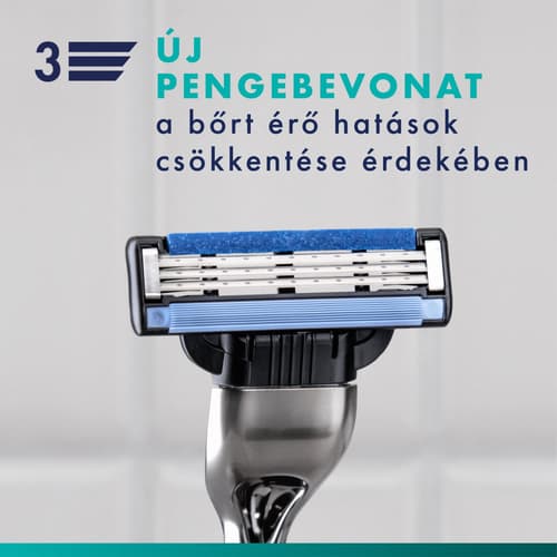 3 éles penge: Egyszerű, precíz és alapos borotválkozást biztosító 3 pengés rendszer, amelyet a bőrt érő hatások csökkentése érdekében terveztek* (*1. és 3. penge)