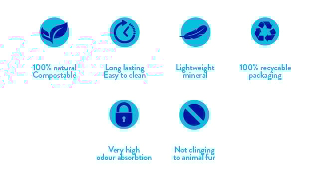 Thanks to the mixture of bentonite and rare diatomaceous earth, which is created from dead microorganisms, the litter has good clumping and absorption properties and is about 25% lighter than classic bentonite litter.