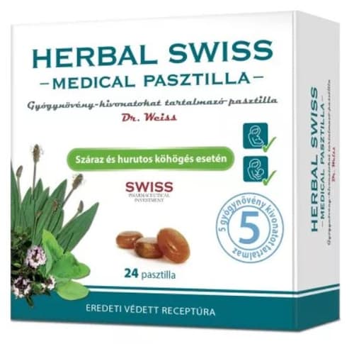 A Herbal Swiss Medical Pasztilla 5 gyógynövény egyedülálló kombinációját tartalmazza (Lándzsás útifű, Indiai tömjén, Kakukkfű, Bazsalikom, Eukaliptusz), amelyek segítenek enyhíteni a megfázással kapcsolatos tüneteket.