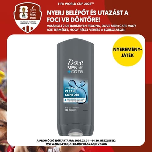 Az egészséges külsejű bőrhöz olyan tusfürdőre van szükséged, mely nem csak tisztítja, de hidratálja is bőröd. A Dove Men+Care pontosan ezt nyújtja Neked. Kifejezetten a férfiak igényeire szabva, a Dove Men+Care tusfürdők Micro Moisture technológiának köszönhetően segítenek megóvni a férfiak bőrét a kiszáradástól. A testen és arcon egyaránt használható Dove Men+Care tusfürdők tisztítják a bőrt és kellemes érzést adnak. Fedezd fel termékválasztékunkat! Dove Men+Care Clean Comfort férfi tusfürdő Micro Moisture technológiával hidratálja bőröd, hogy segítsen megőrizni egészséges külsejét és védeni a kiszáradás ellen. Hatékony formuláját könnyű lemosni, így friss és tiszta, kényelmes érzetet biztosít bőrödnek. A Dove Men+Care Clean Comfort férfi tusfürdő egyedülálló Micro Moisture technológiája habképződés során aktiválódik és segít bőröd természetes nedvességtartalmának megtartásában. Ez a bőrgyógyászatilag tesztelt férfi tusfürdő tiszta érzetet és friss illatot hagy maga után, valamint segít védeni a bőrt a kiszáradás ellen. Ezzel az férfias és hatékony tusfürdővel egészséges, friss érzetű bőrrel indíthatod a napod!