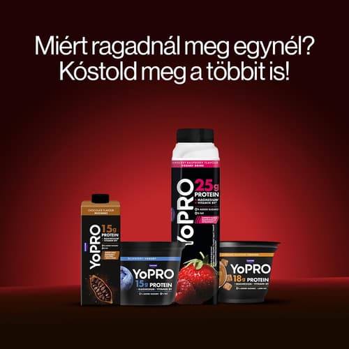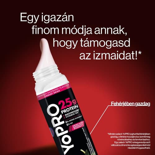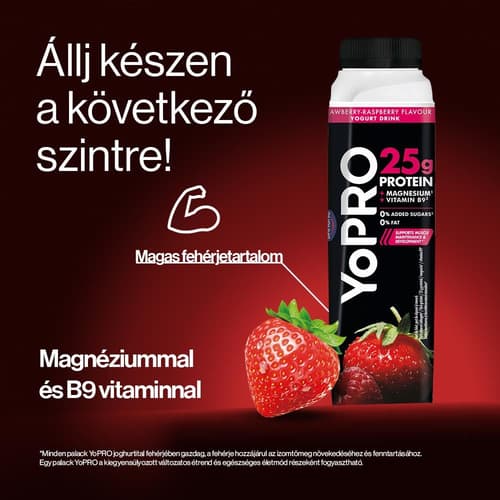 YoPRO eper- és málnaízű sovány tejital, TELE PROTEINNEL, TELE ÍZZEL.