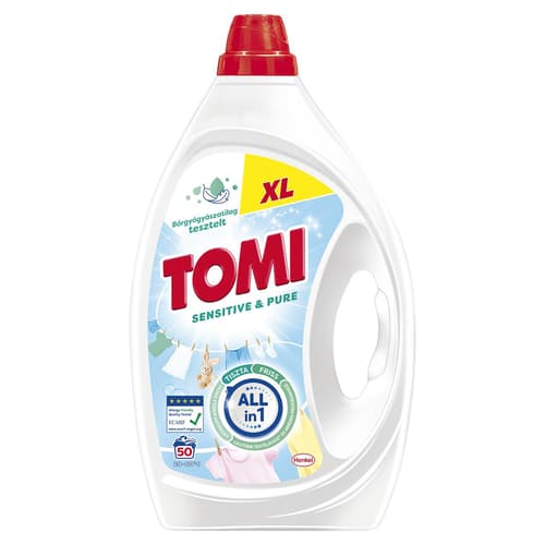 Tomi Sensitive & Pure folyékony mosószer kifejezetten az érzékeny bőr számára kifejlesztve! A Tomi Sensitive & Pure hatékonyan távolítja el a foltokat a textíliákból, kimondottan az érzékeny bőr számára kifejlesztve. - Hipoallergén parfümmel - 0% színezékkel - Bőrgyógyászatilag tesztelt és ECARF tanúsítvánnyal rendelkezik - 100%-ban újrahasznosítható flakonba.