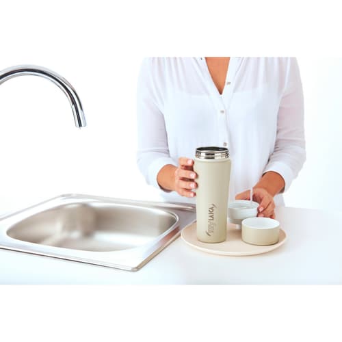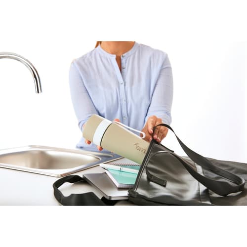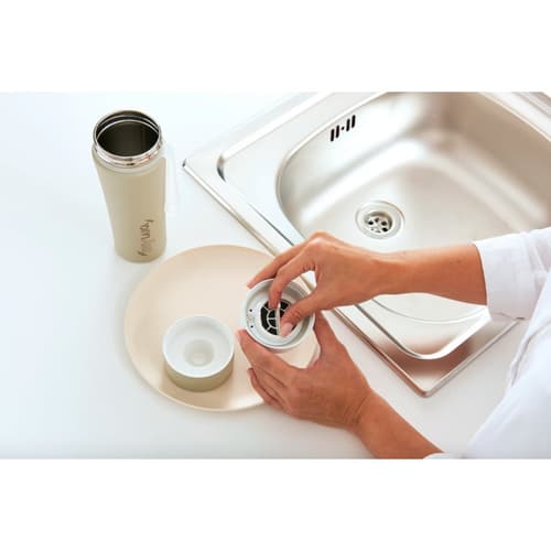 myLaica rozsdamentes matt bézsre festett fast disk rendszerű vízszűrő kulacs pánttal