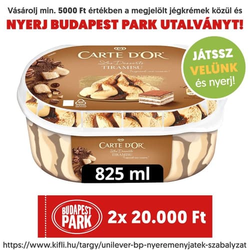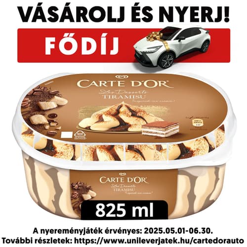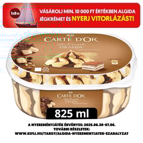 Carte D'Or tiramisu ízű jégkrém kávés szósszal kávés piskótatallérokkal. Tiramisu ízű jégkrém kávés szósszal, kávés piskótatallérokkal a tetején zsírszegény kakaópor szórattal.