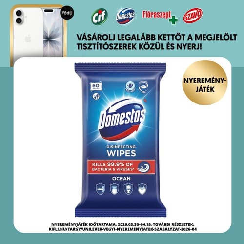 Tartsa otthonát higiénikusan tisztán a Domestos Ocean higiénikus törlőkendőkkel! Ezek a praktikus nedves kendők egyszerű és gyors tisztítást biztosítanak számos felületen, a konyhapulttól az ajtókilincsekig. Minden visszazárható csomag 60 darab, friss óceáni illatú kendőt tartalmaz, ideálisak mindennapi használatra vagy útközbeni tisztaságra. Egyszerűen törölje át, öblítés és szárítás nélkül, így könnyedén biztosíthatja a higiénikus felületeket. Ne dobja a WC-be!