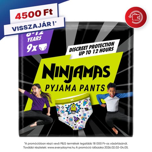 Bemutatjuk a Ninjamas Pyjama bugyipelenkát. Vedd fel a harcot az éjszakai bepisilésekkel szemben, és ébredj magabiztosan az egész éjszakán át tartó szivárgás elleni védelemnek köszönhetően. A Ninjamas azonnali nedvszívó technológiája rögtön felszívja a nedvességet, a még soha nem tapasztalt hatékonyságú védelemért. A 360°-os FormFit derékrész igazodik a gyerekek derekához, ami alsóneműhöz hasonló diszkrét és kényelmes illeszkedést tesz lehetővé, így vidáman és kipihenten ébredhetnek minden nap.