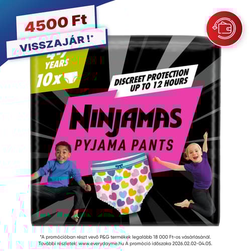 Bemutatjuk a Ninjamas Pyjama bugyipelenkát. Vedd fel a harcot az éjszakai bepisilésekkel szemben, és ébredj magabiztosan az egész éjszakán át tartó szivárgás elleni védelemnek köszönhetően. A Ninjamas azonnali nedvszívó technológiája rögtön felszívja a nedvességet, a még soha nem tapasztalt hatékonyságú védelemért. A 360°-os FormFit derékrész igazodik a gyerekek derekához, ami alsóneműhöz hasonló diszkrét és kényelmes illeszkedést tesz lehetővé, így vidáman és kipihenten ébredhetnek minden nap.