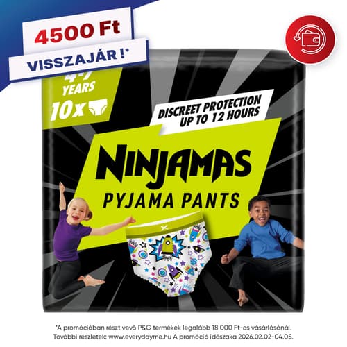 Bemutatjuk a Ninjamas Pyjama bugyipelenkát. Vedd fel a harcot az éjszakai bepisilésekkel szemben, és ébredj magabiztosan az egész éjszakán át tartó szivárgás elleni védelemnek köszönhetően. A Ninjamas azonnali nedvszívó technológiája rögtön felszívja a nedvességet, a még soha nem tapasztalt hatékonyságú védelemért. A 360°-os FormFit derékrész igazodik a gyerekek derekához, ami alsóneműhöz hasonló diszkrét és kényelmes illeszkedést tesz lehetővé, így vidáman és kipihenten ébredhetnek minden nap.