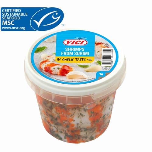 A VICI Garnélarák ízű surimi fokhagymás olajban MSC minősítéssel rendelkező termék, amely a tenger gyümölcsei alapján készült. A garnélarák ízű surimi a kama felhasználásával készül, amely egy feldolgozott halhús vagy halfehérje alapanyag. Ezeket a surimiket fokhagymás olajban pácolják, így gazdag és ízletes ízekkel rendelkeznek. A fokhagymás olaj hozzáadja a termékhez a pikáns és aromás ízjegyeket, amelyek még kellemesebbé teszik a fogyasztói élményt.