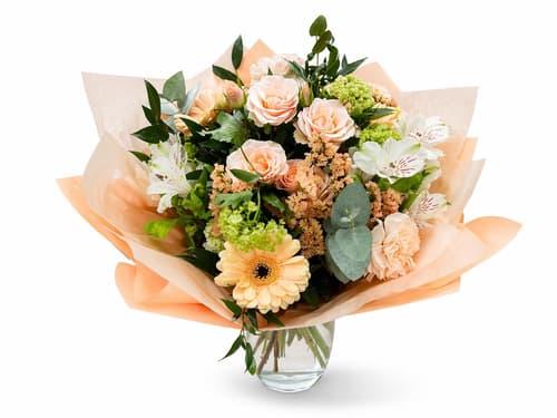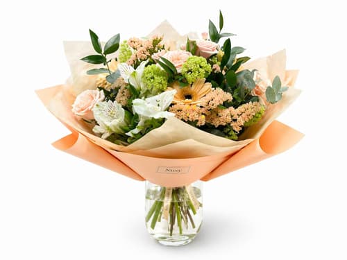 Lepd meg szeretteidet a Nusy Flower & Home barack színű csokrával! Ez a magyar termék santini krizantémot, spray rózsát, szegfűt és zinniát tartalmaz hazai termelőktől, szezonális zöldekkel kiegészítve. Egy darabos, vízálló díszcsomagolásban érkezik, így azonnal gyönyörű ajándék. Frissessége garantált, csak vágd átlósan a szárakat, mielőtt vízbe helyezed, hogy sokáig gyönyörködhess benne.