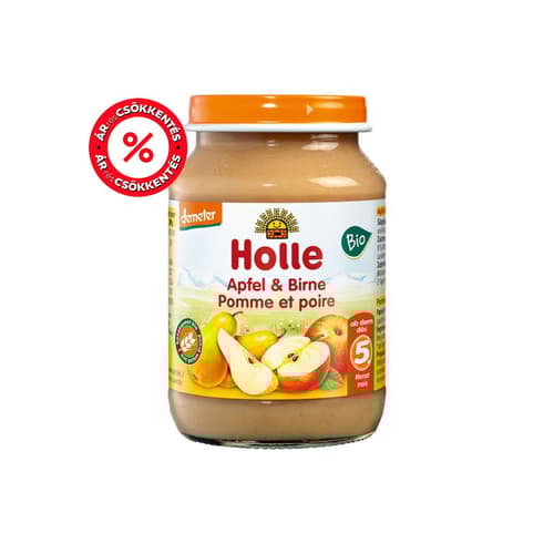 A Holle Bio bébiétel alma-körtével 100% bio minőségben, Demeter minősítésű alapanyagokból, hozzáadott só, cukor, valamint ízesítők nélkül készül, BPA-mentes csomagolással. Gluténmentes, laktózmentes, vegán termék. Fogyasztása 5 hónapos kortól ajánlott.