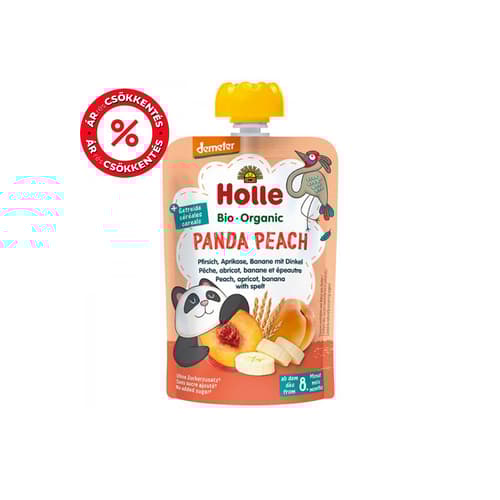A Holle Bio Panda Peach - Tasak őszibarack, sárgabarack, banán tönköllyel 100% bio minőségben, Demeter minősítésű alapanyagokból, hozzáadott só, cukor, valamint ízesítők nélkül készül, alumínium-mentes csomagolással. Gyümölcstartalma 98%.  Ideális desszertnek, kisétkezésekhez vagy étkezések között, valamint útközben. Praktikus, visszazárható csomagolásban. A tasak megőrzi a természetes ízt. Vegán termék. Fogyasztása 8 hónapos kortól ajánlott.