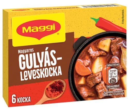 A Maggi Magyaros Gulyásleveskocka hamisítatlan magyaros ízvilágot és gyönyörű piros színt ad az ételeknek. Különösen ajánljuk gulyásleves, bableves, székelykáposzta, babgulyás és bográcsgulyás készítéséhez. Minden Maggi termék szárított összetevőkből készül, ezzel biztosítjuk a termékek eltarthatóságát, és ennek köszönhetően nincs szükség tartósítószer hozzáadására sem.