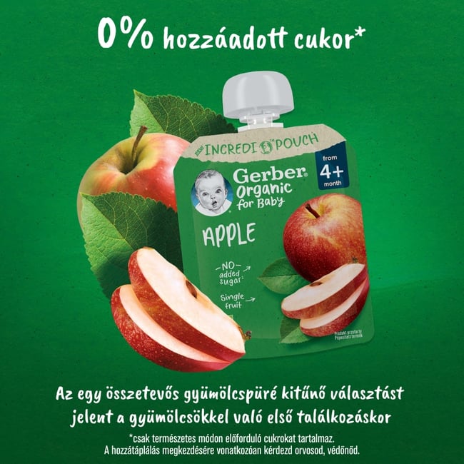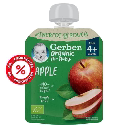 Gerber Organic bio egy összetevős gyümölcspüréi ideálisak a hozzátáplálás kezdeti szakaszában a tízórai vagy uzsonna kiegészítésére.